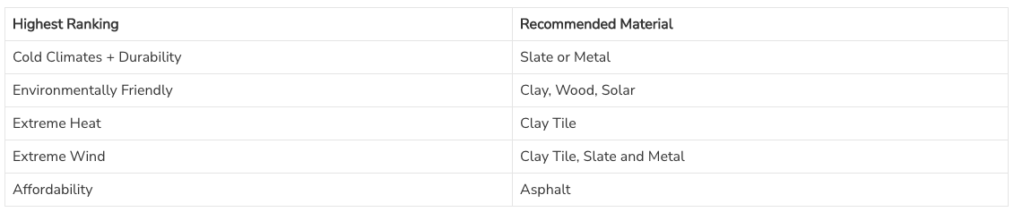 The best place to start is with budget and climate. These two factors will dictate the options available to you. It is also important to consider the design and the overall structure of your roof. For example, asphalt shingles are commonly used here in New England because they are affordable and energy efficient. If you live in a warmer climate and are looking for more of a design statement, materials like clay tile are often used. Reference the chart below to get a better sense of which roofing material is right for you. Prefer to speak with someone directly? Give us a call at (401) 246-0711 and our roofing team will be happy to assist.